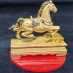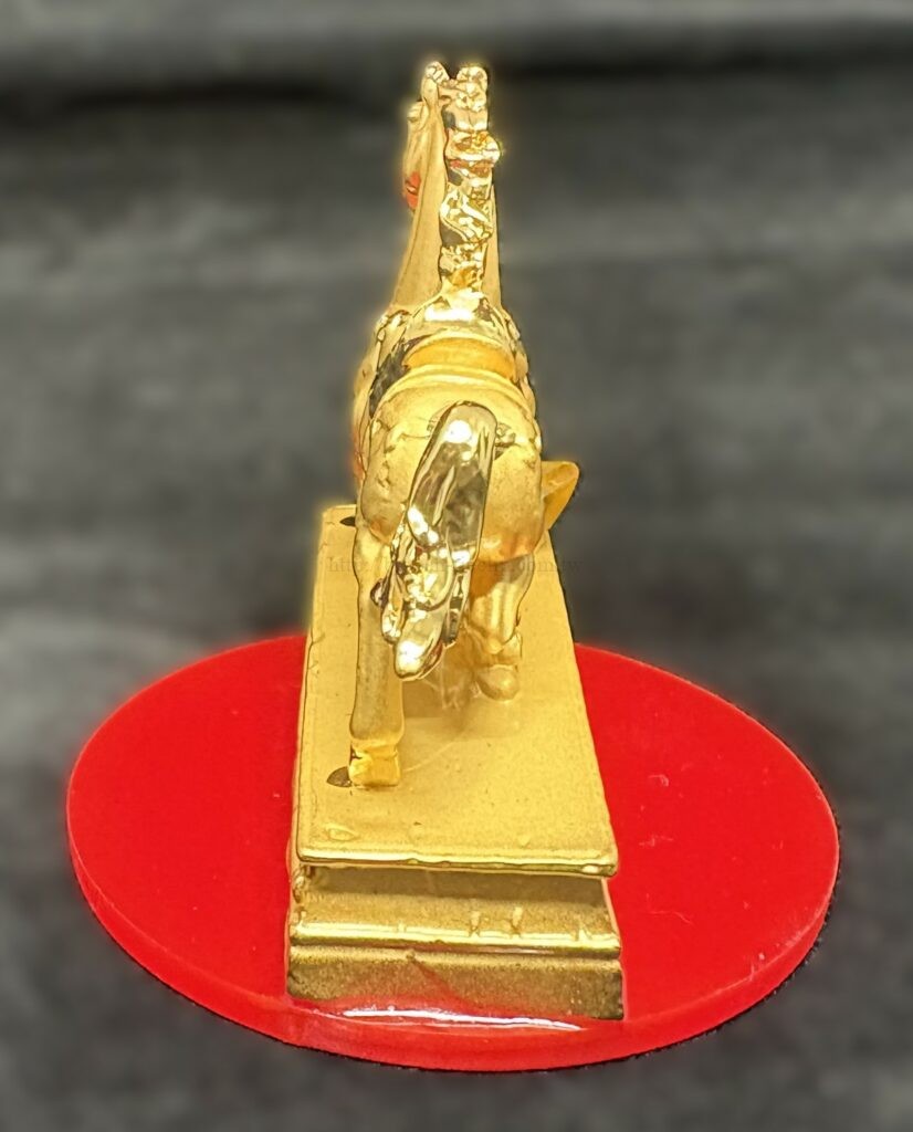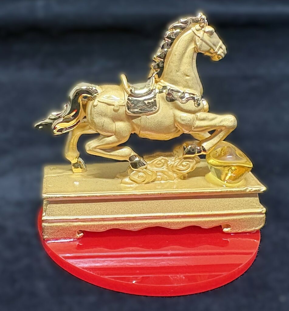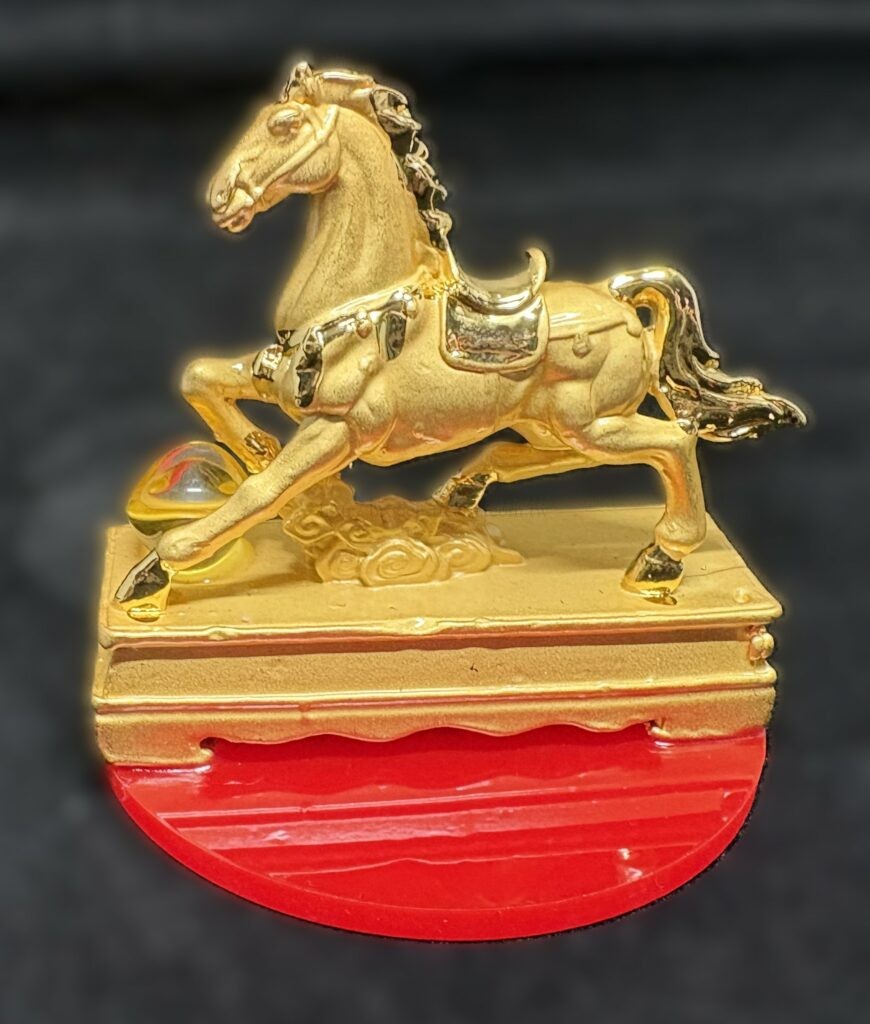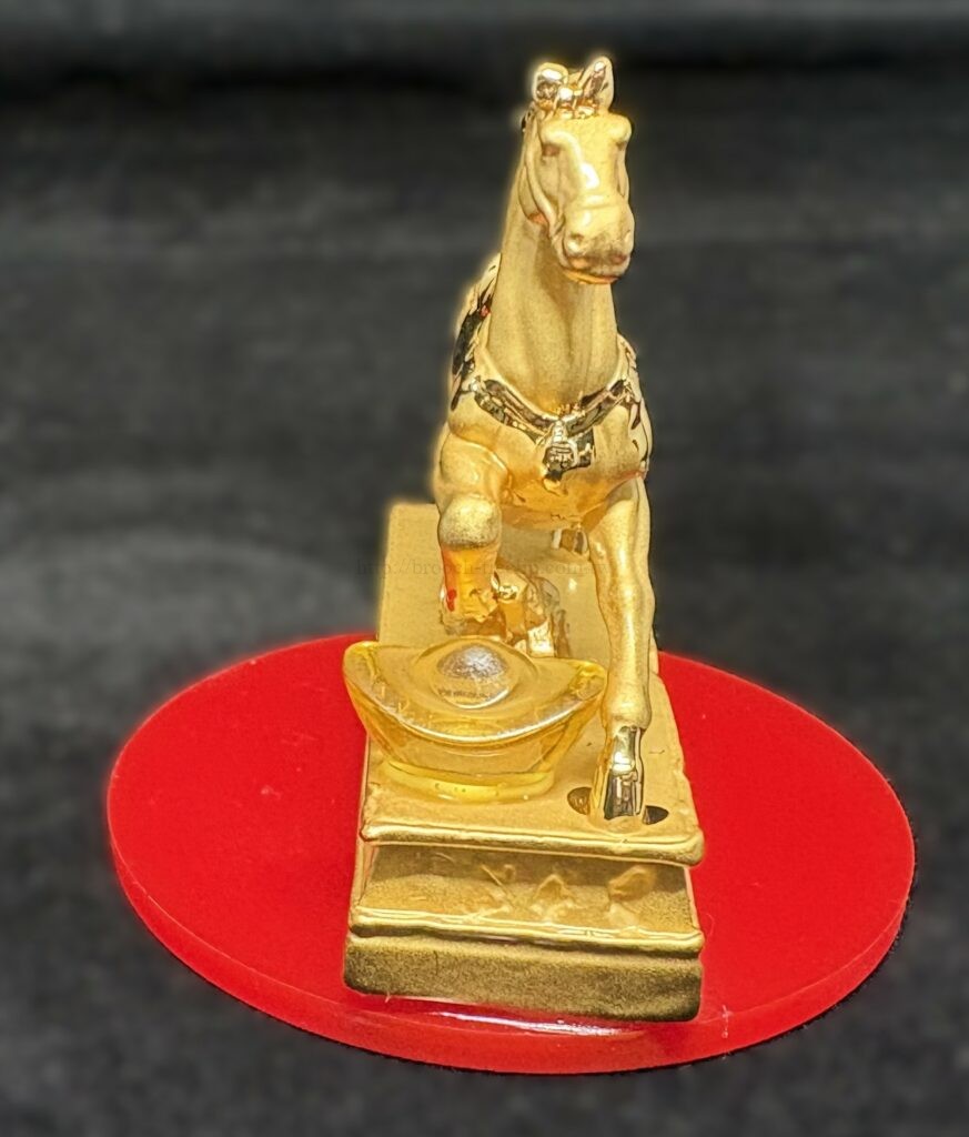 金色駿馬昂首奔馳,腳踏祥雲,馬前擺放元寶,象徵「馬上有錢」,財富滾滾而來。整體造型立體細緻,金色光澤沉穩大氣,搭配紅色圓形底座,更添喜氣與開運氣場。